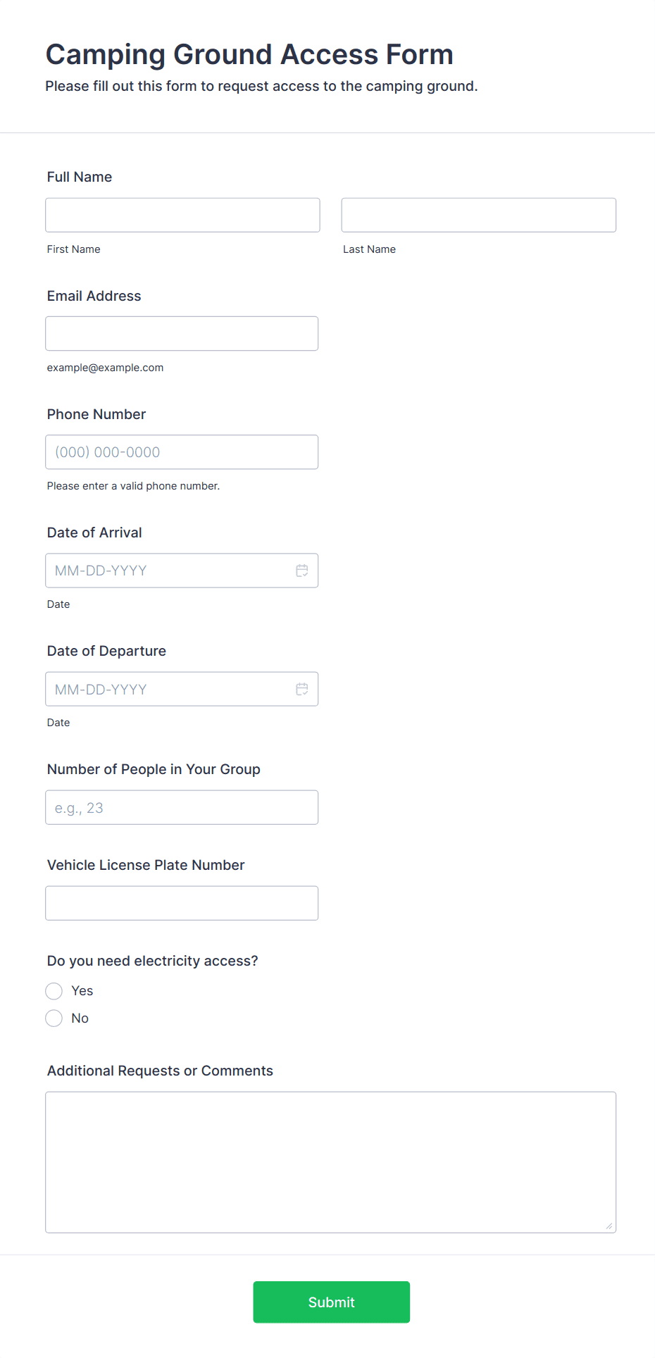 A simple form template which allows customers to submit their booking inquiry or any other comment with their contact information that would allow you to conveniently respond your customers to confirm the booking availability.