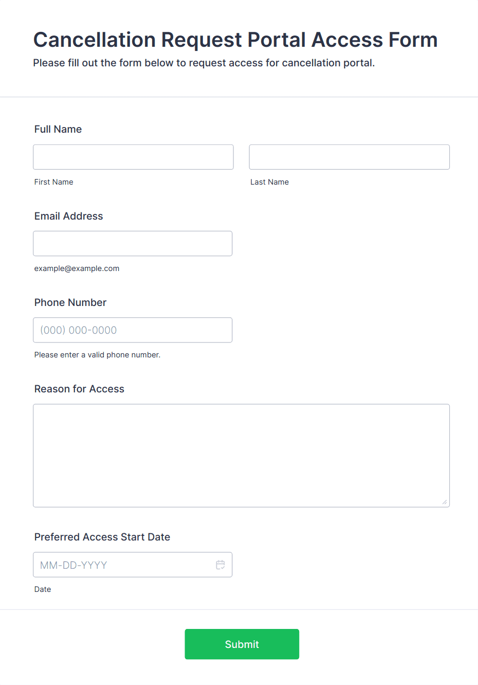 • For payment-related cancellations, include fields for refund preferences or payment details.