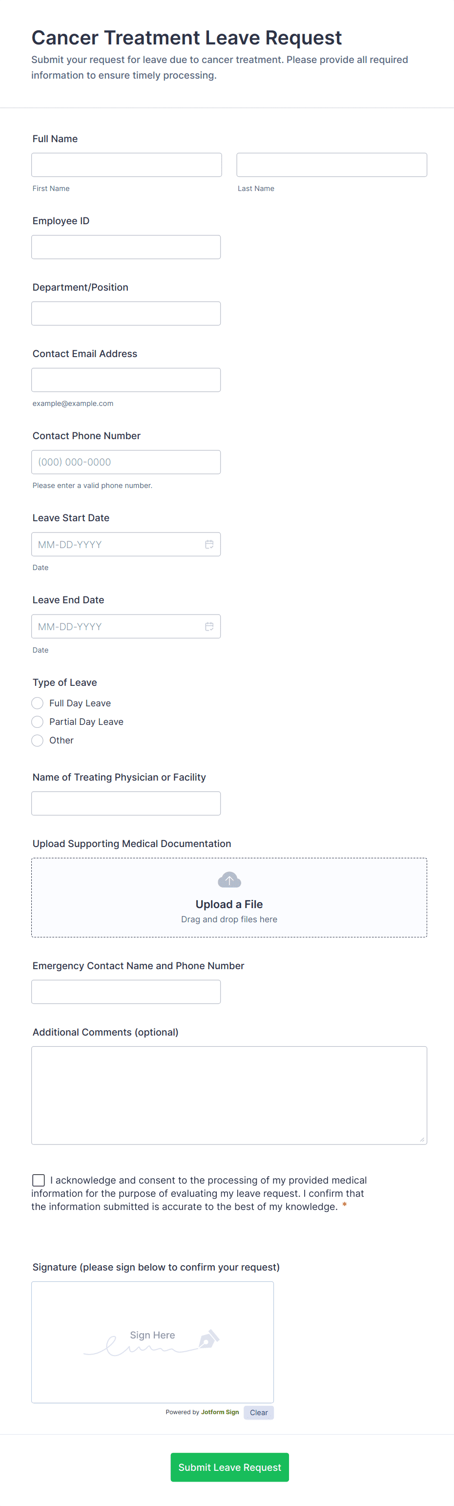 - Use Jotform’s conditional logic to show or hide fields based on the type of leave selected.