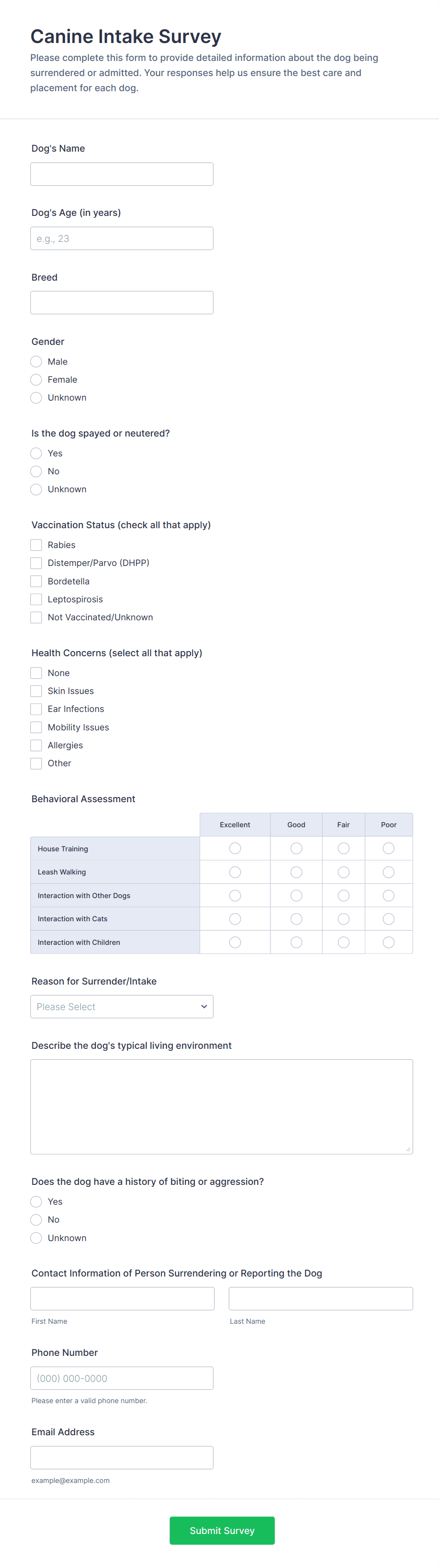 An animal shelter form template is a pre-designed online form that helps animal shelters and rescue organizations collect and manage information for processes like adoptions, volunteering, donations, and animal intake.