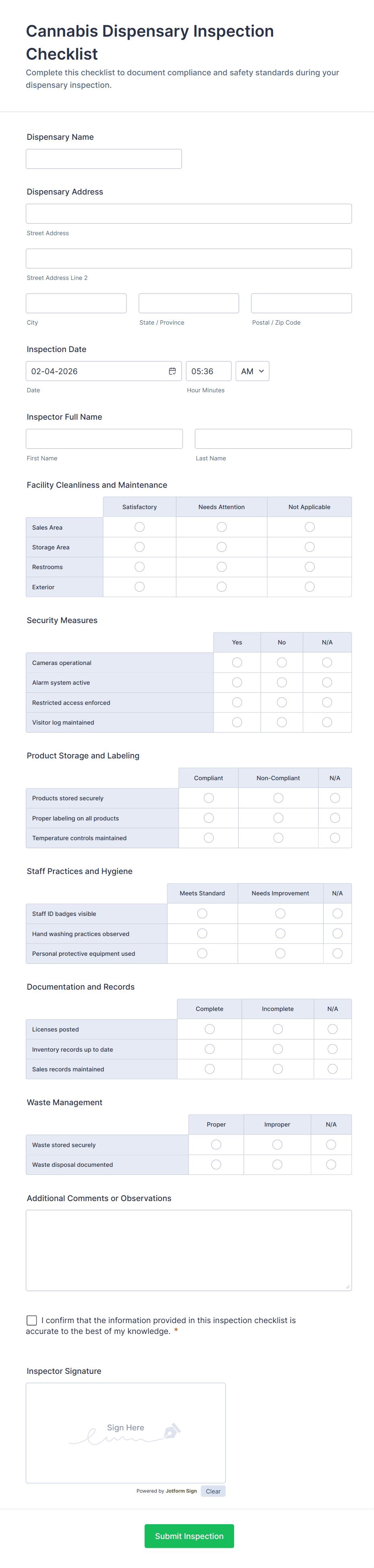 Creating an effective inspection form with Jotform is straightforward and highly customizable, allowing you to address the unique requirements of your inspection process. Whether you’re conducting safety audits, equipment checks, or property walkthroughs, Jotform’s platform ensures your forms are comprehensive, user-friendly, and accessible from any device.