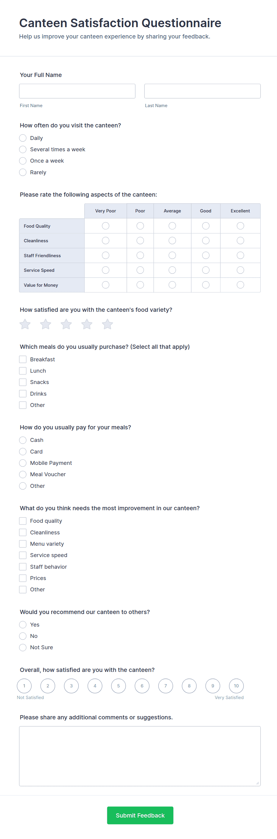 • For customer feedback, include satisfaction ratings and open-ended comment fields.