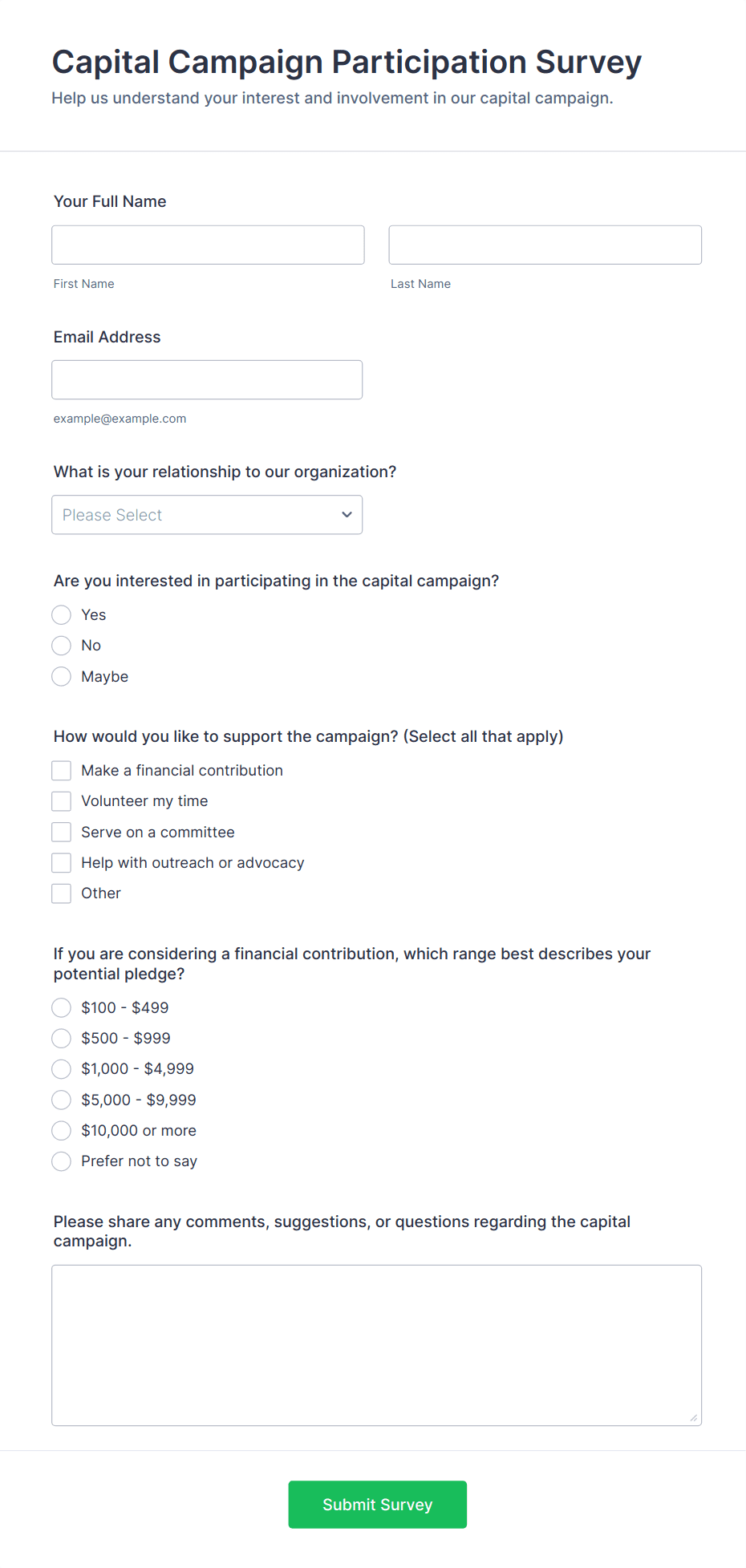- For customer satisfaction surveys, include Net Promoter Score (NPS) fields or star ratings.