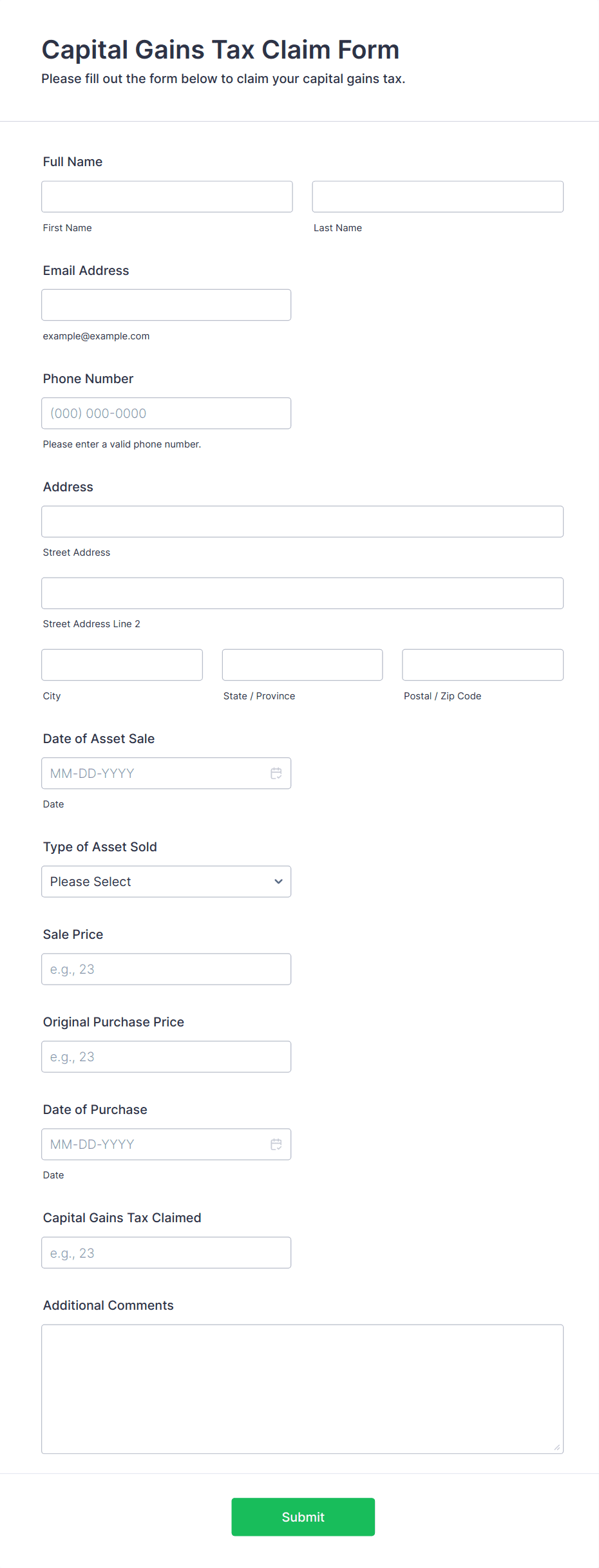Common fields include personal or business identification details, tax identification numbers, income amounts, deductions, filing status, and supporting documentation such as receipts or invoices.