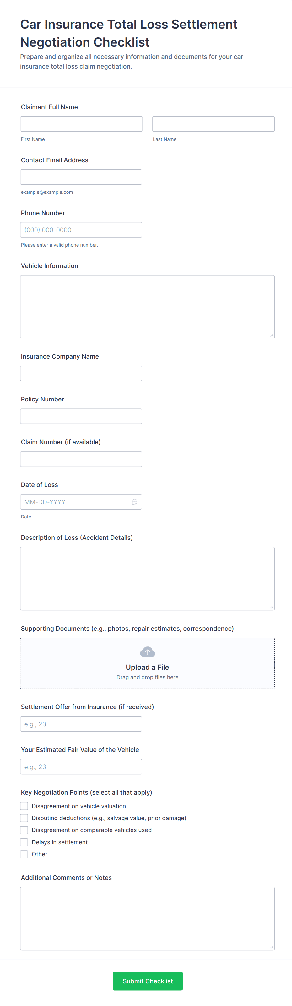 - Insurance Claims: Require detailed incident descriptions, policy numbers, and supporting documents (e.g., photos, police reports).