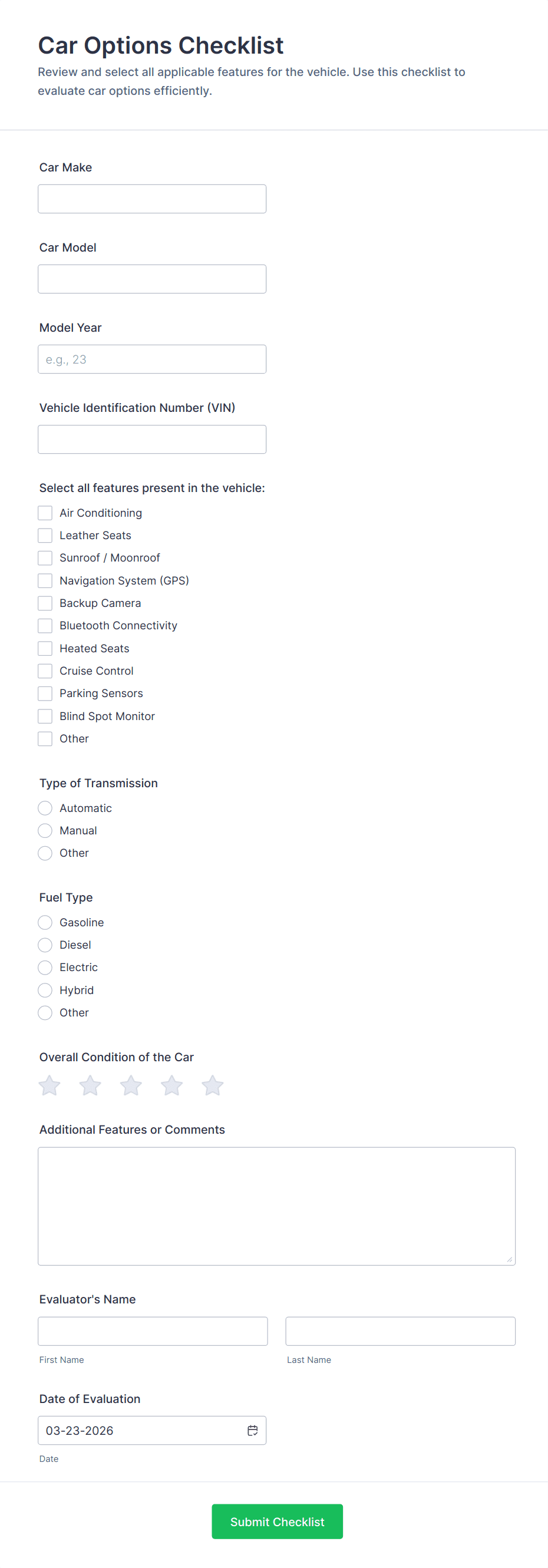 - For pre-purchase inspections, add detailed mechanical and cosmetic checklists.