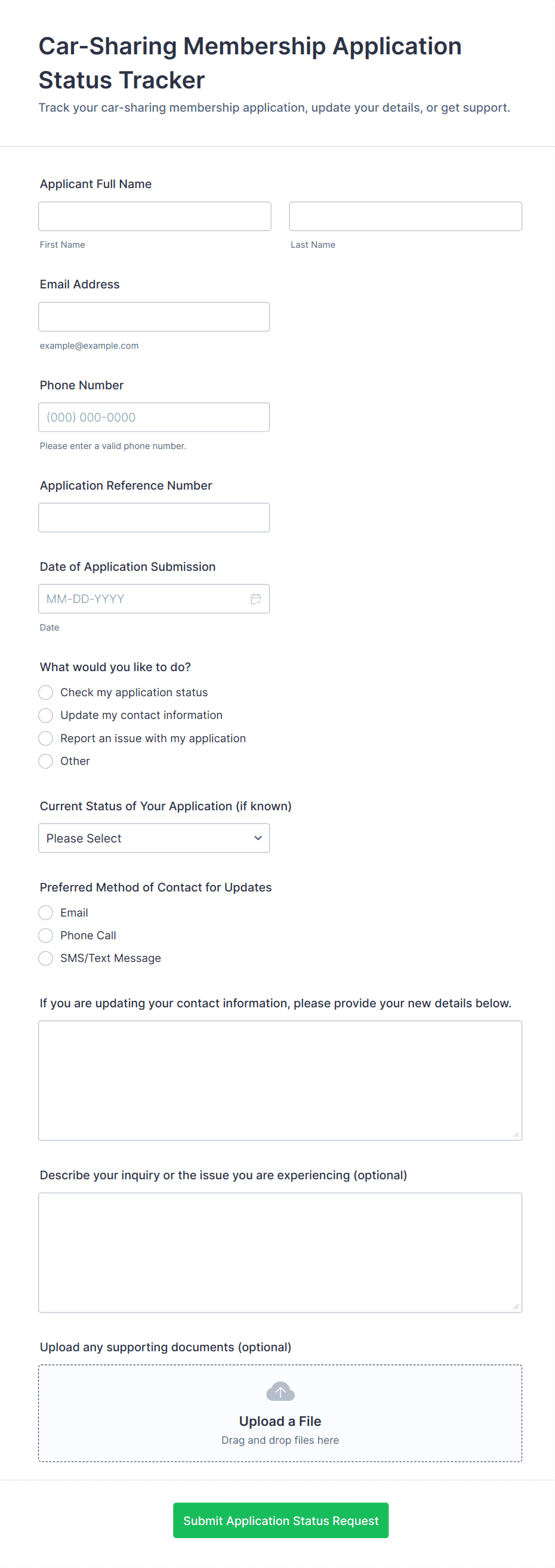 • File upload (for ID, certifications, or supporting documents)