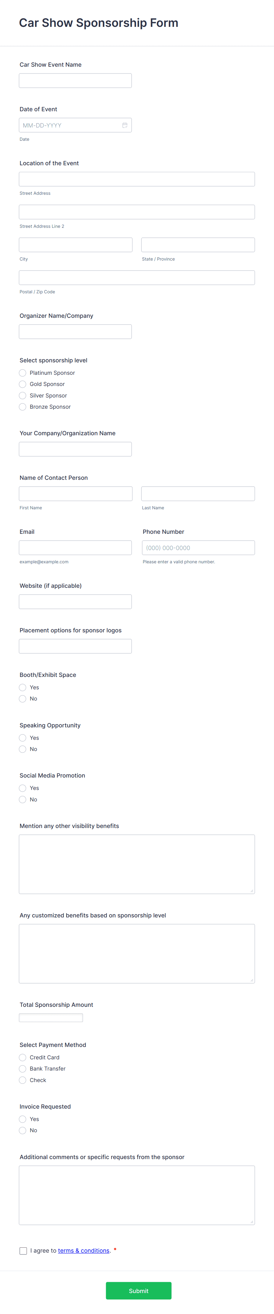 - Use conditional logic to show or hide fields based on sponsor selections (e.g., only display payment fields for monetary sponsors).