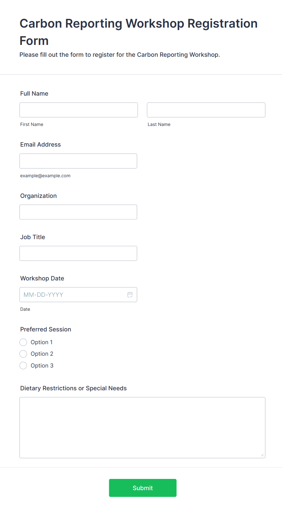 A Workshop Registration Form Template is a pre-designed online form that helps organizers collect participant information, preferences, and payments for workshops or training events.