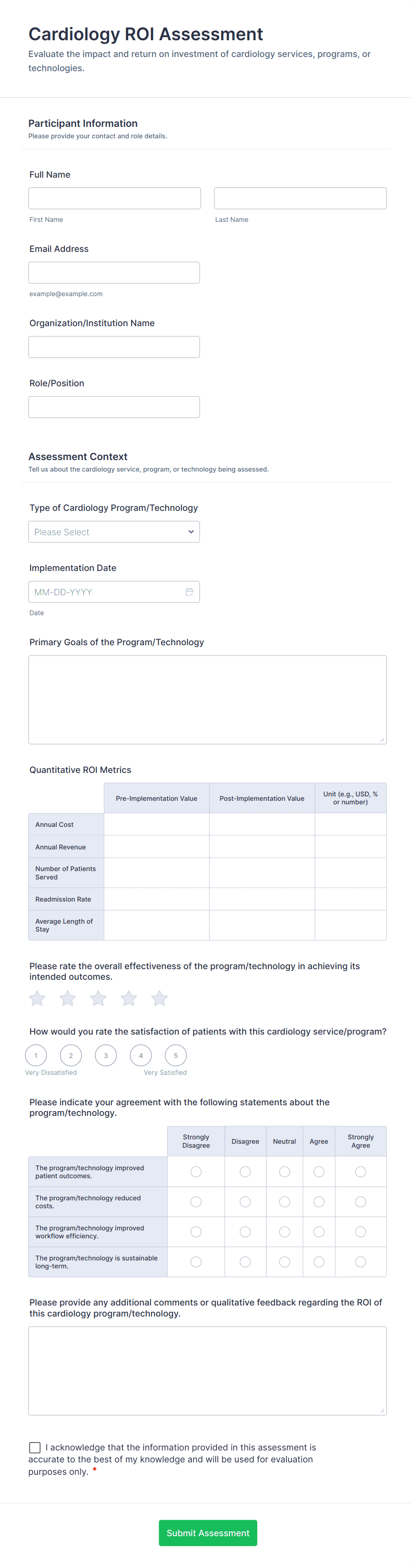 Healthcare assessment forms are structured documents used to collect and evaluate patient health information to support clinical decisions, care planning, and ongoing monitoring. They help healthcare teams capture consistent details about symptoms, medical history, risk factors, functional status, and care needs in a clear and organized way. Healthcare assessment forms are commonly used in clinics, hospitals, telehealth services, rehabilitation centers, home care, and specialty practices for intake assessments, screening evaluations, follow-up check-ins, and condition monitoring. By standardizing assessment workflows, these forms improve documentation quality, reduce missing information, and support safer, more coordinated care.