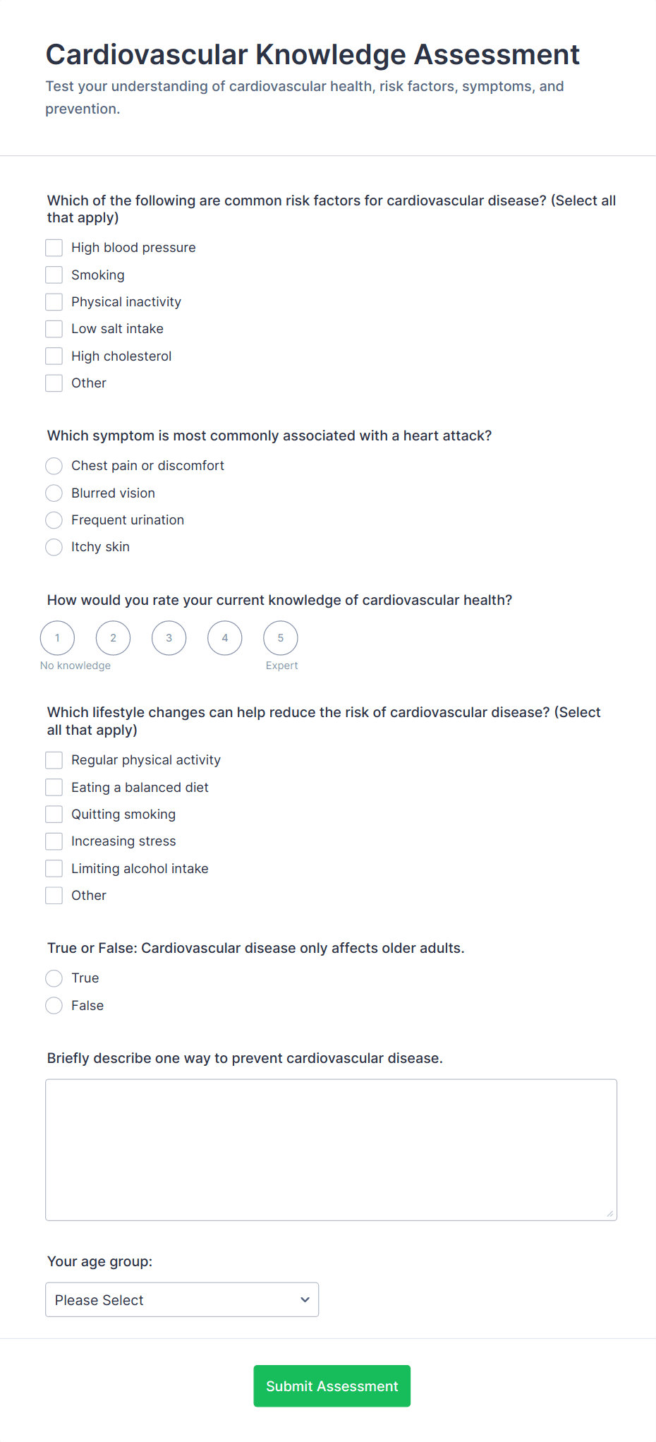 Healthcare assessment forms are structured documents used to collect and evaluate patient health information to support clinical decisions, care planning, and ongoing monitoring. They help healthcare teams capture consistent details about symptoms, medical history, risk factors, functional status, and care needs in a clear and organized way. Healthcare assessment forms are commonly used in clinics, hospitals, telehealth services, rehabilitation centers, home care, and specialty practices for intake assessments, screening evaluations, follow-up check-ins, and condition monitoring. By standardizing assessment workflows, these forms improve documentation quality, reduce missing information, and support safer, more coordinated care.