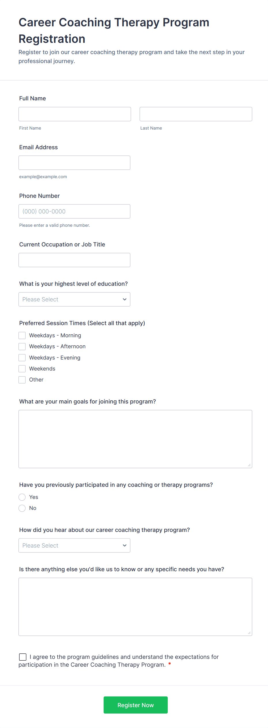 • For event or course registrations, include fields for session selection, preferences, or special requirements.