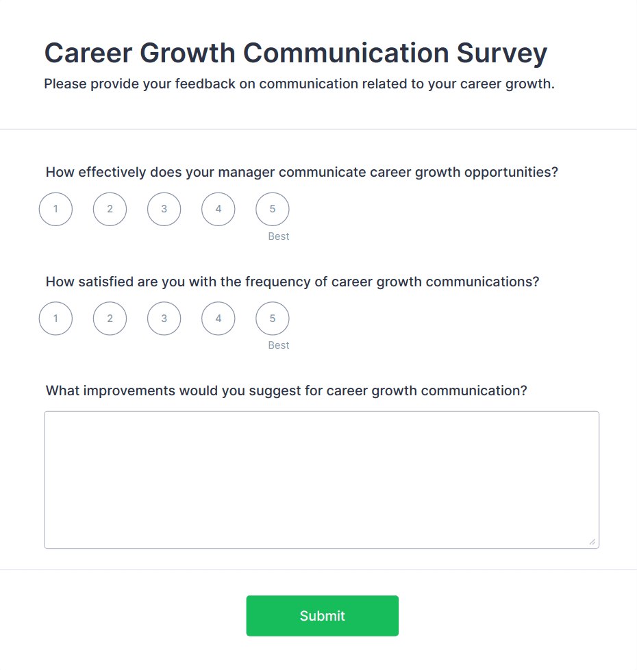- Employee Surveys: May include questions on leadership, work-life balance, and recognition.