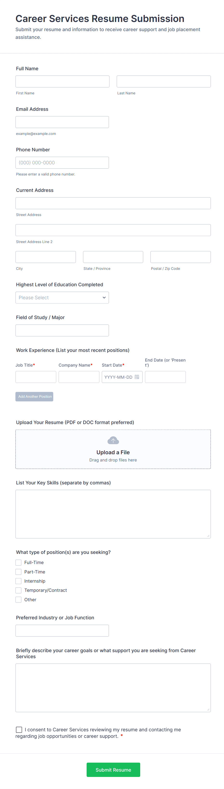 • Job Applications: Add fields for position applied for, cover letter, and portfolio uploads.