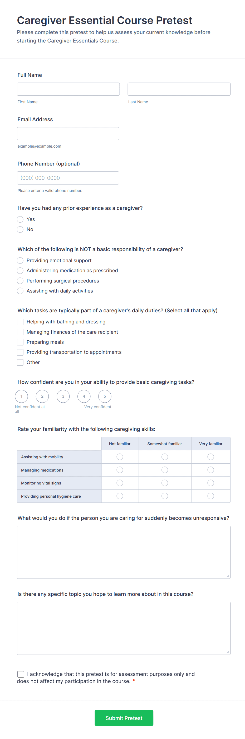 - Pre-Training Assessments: Use multiple-choice, dropdowns, and short text fields to gauge baseline knowledge.