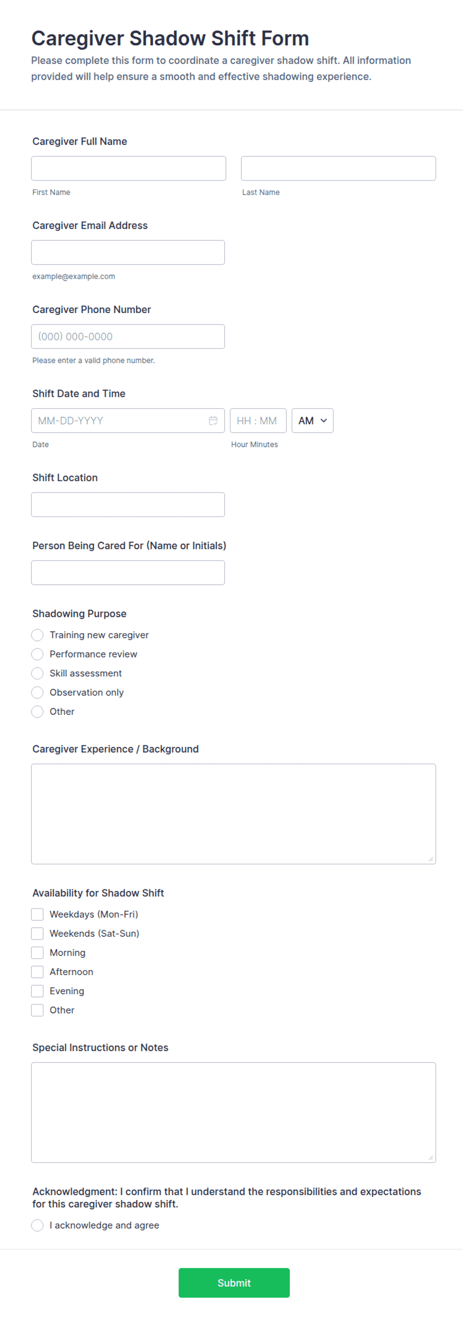 Caregiver forms are online forms used to collect information regarding childcare services, like parent contact information, childrens’ medical history and prescriptions, waivers, caregiver job applications, and more. Need to collect information, payments, or e-signatures for your childcare services? Choose a ready-made Caregiver Form template to do it instantly on any device.