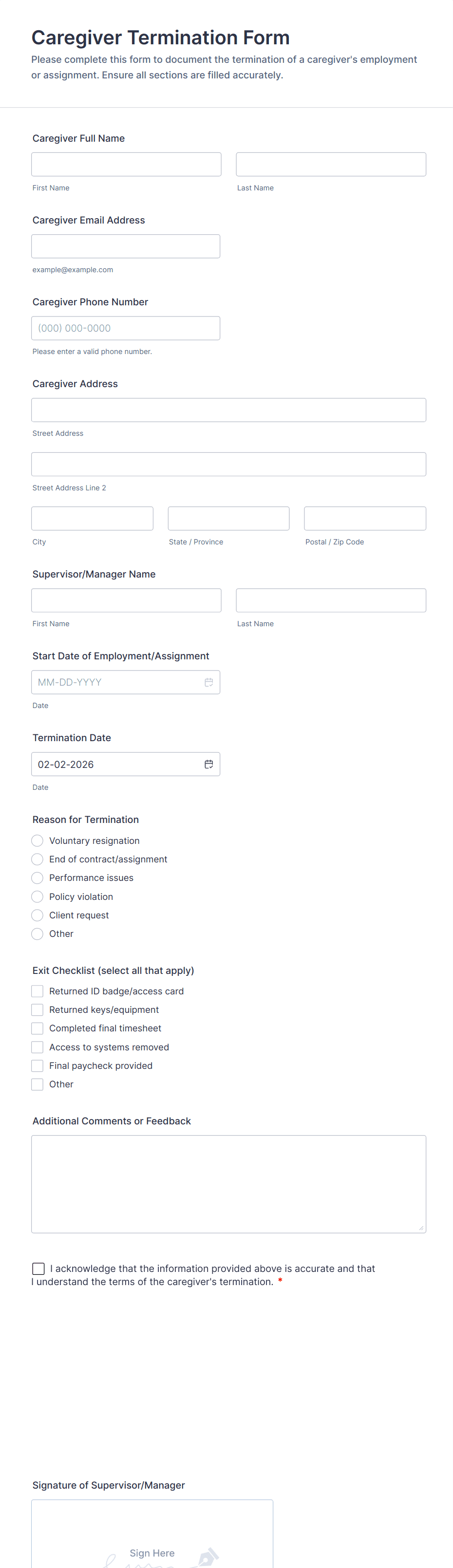 Caregiver forms are online forms used to collect information regarding childcare services, like parent contact information, childrens’ medical history and prescriptions, waivers, caregiver job applications, and more. Need to collect information, payments, or e-signatures for your childcare services? Choose a ready-made Caregiver Form template to do it instantly on any device.