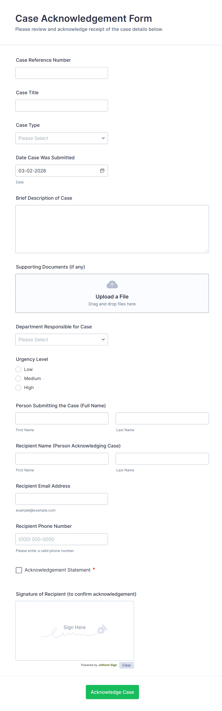 - Digital signature fields for legal acknowledgment