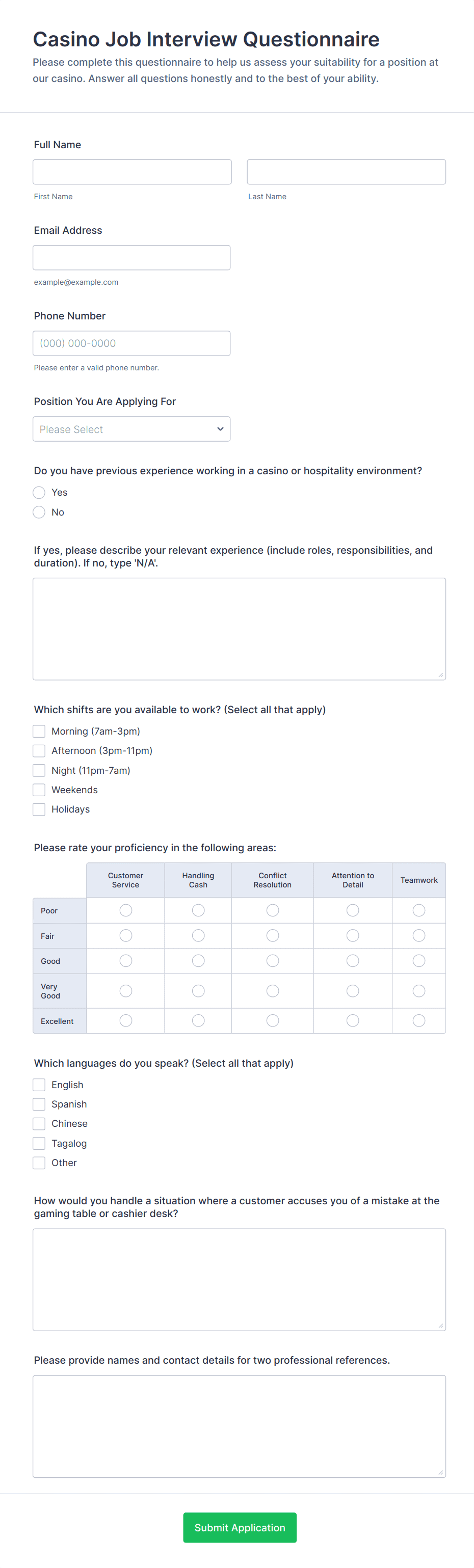 The Customer Support Interview Form helps HR professionals collect candidate information for customer service roles, streamlining the interview process and improving data collection.