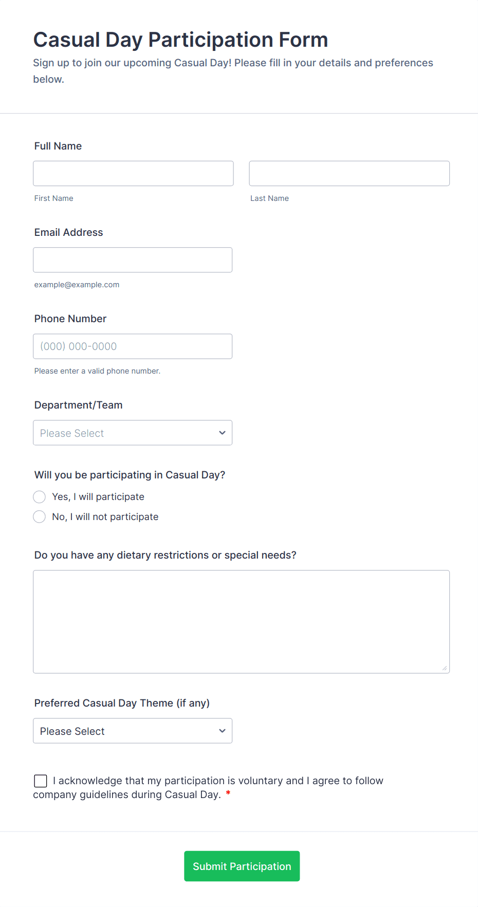 • Content and fields vary based on event type: For example, a conference form may include session selection and company details, while a wedding RSVP form might ask for meal preferences and plus-one information.