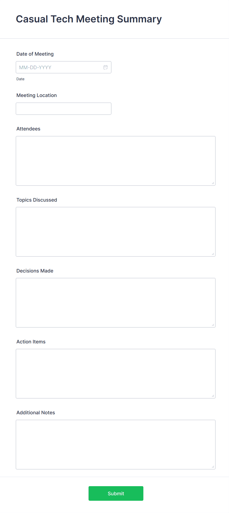 A meeting form is an online tool used to organize, schedule, and manage meetings by collecting essential information such as attendee details, agenda items, and feedback.