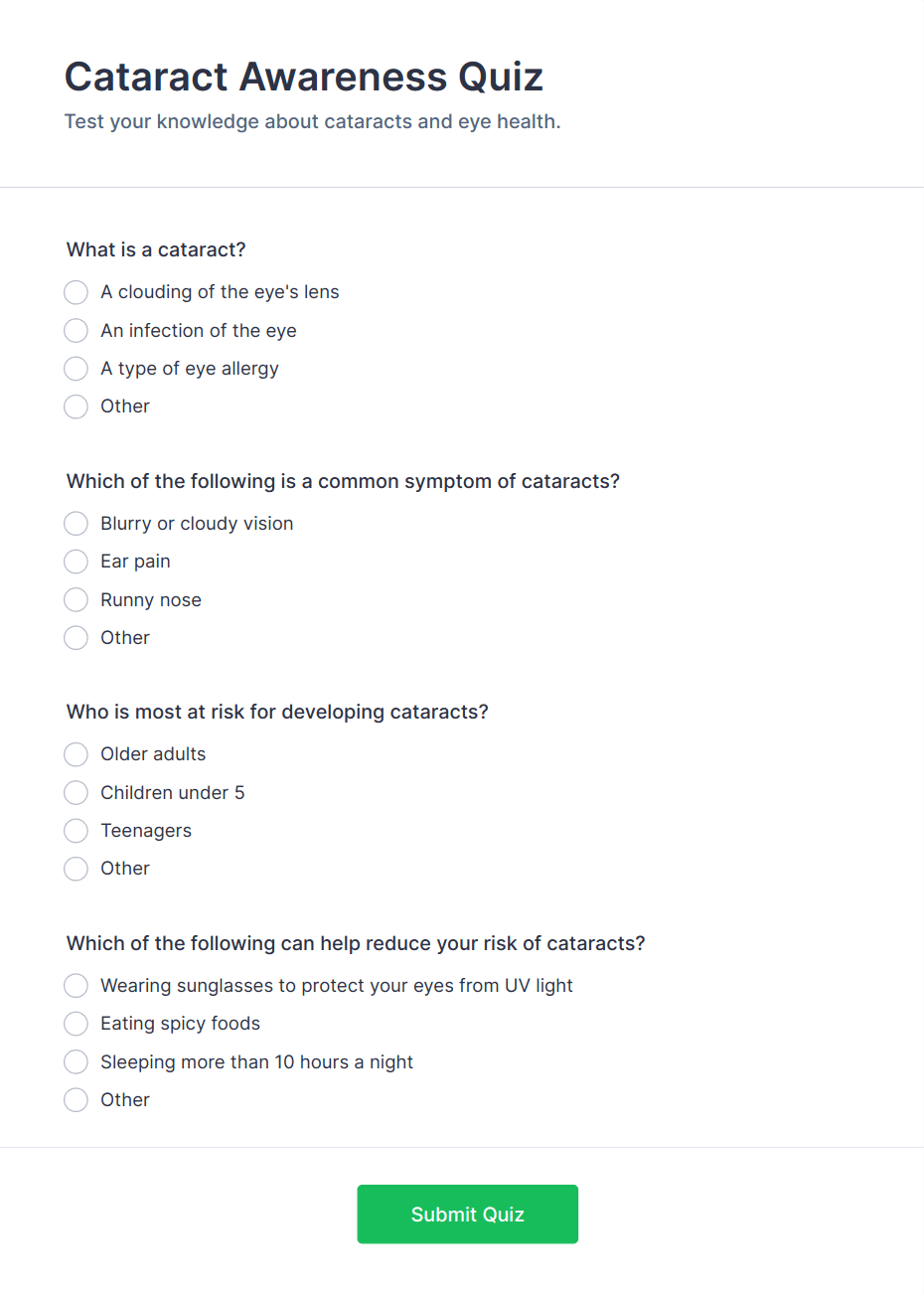 Quiz Templates are pre-designed forms specifically created to facilitate the process of building quizzes for a variety of purposes, such as education, employee training, lead generation, event engagement, and more. These templates provide a structured way to present questions, collect answers, and automatically score or evaluate responses. Whether you’re a teacher assessing student knowledge, a business running a product knowledge test, or a marketer creating a fun personality quiz, Quiz Templates offer a flexible foundation to suit your needs. They can be used for online exams, trivia games, onboarding assessments, customer feedback quizzes, and interactive learning modules.