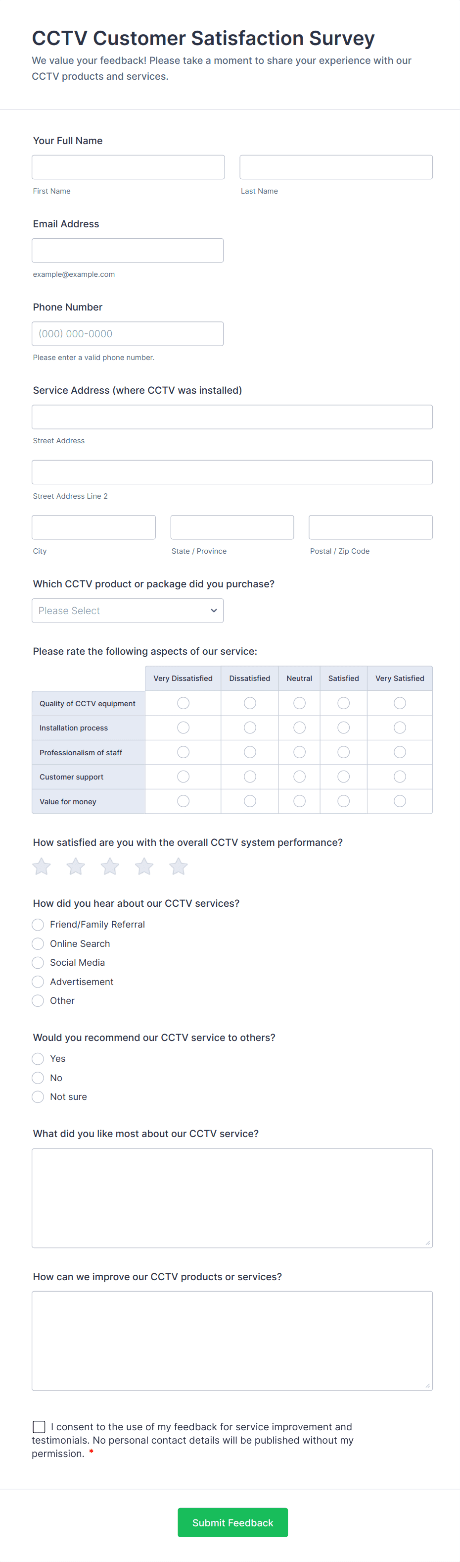 Customer Satisfaction Evaluation Forms are essential tools for gathering feedback from clients, customers, or stakeholders about their experiences with a product, service, or interaction. These forms are designed to measure satisfaction levels, identify areas for improvement, and help organizations understand how well they are meeting customer expectations. Common use cases include post-purchase surveys, service feedback forms, event satisfaction questionnaires, and support interaction evaluations. By systematically collecting and analyzing this feedback, businesses can make informed decisions to enhance their offerings, improve customer loyalty, and address any issues promptly.