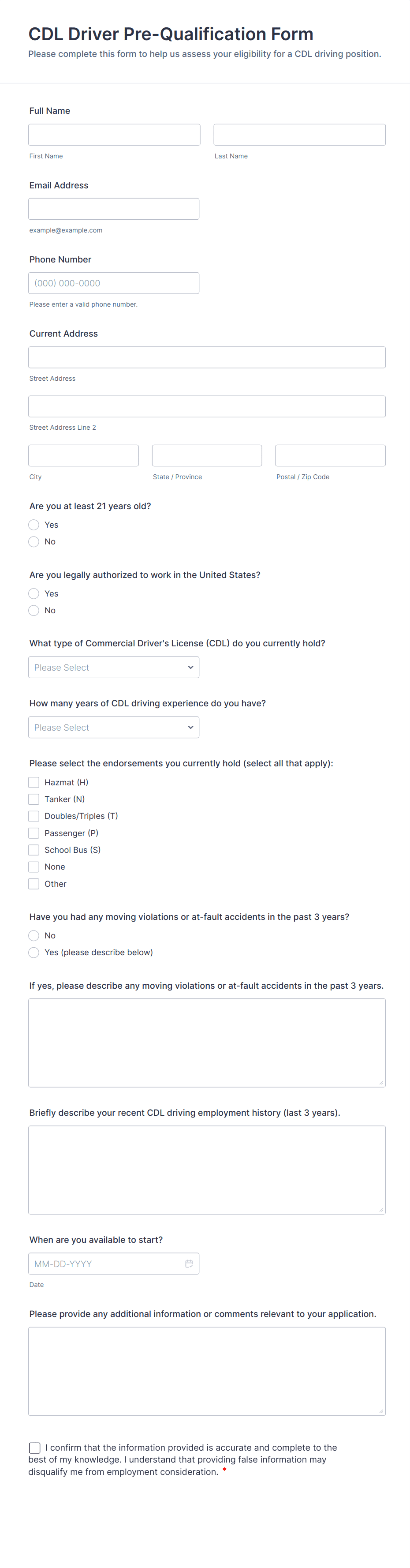 A Truck Driver Application Form is a form template designed to serve as a standardized document for trucking companies or transportation firms to collect essential information from individuals applying for truck driver positions.