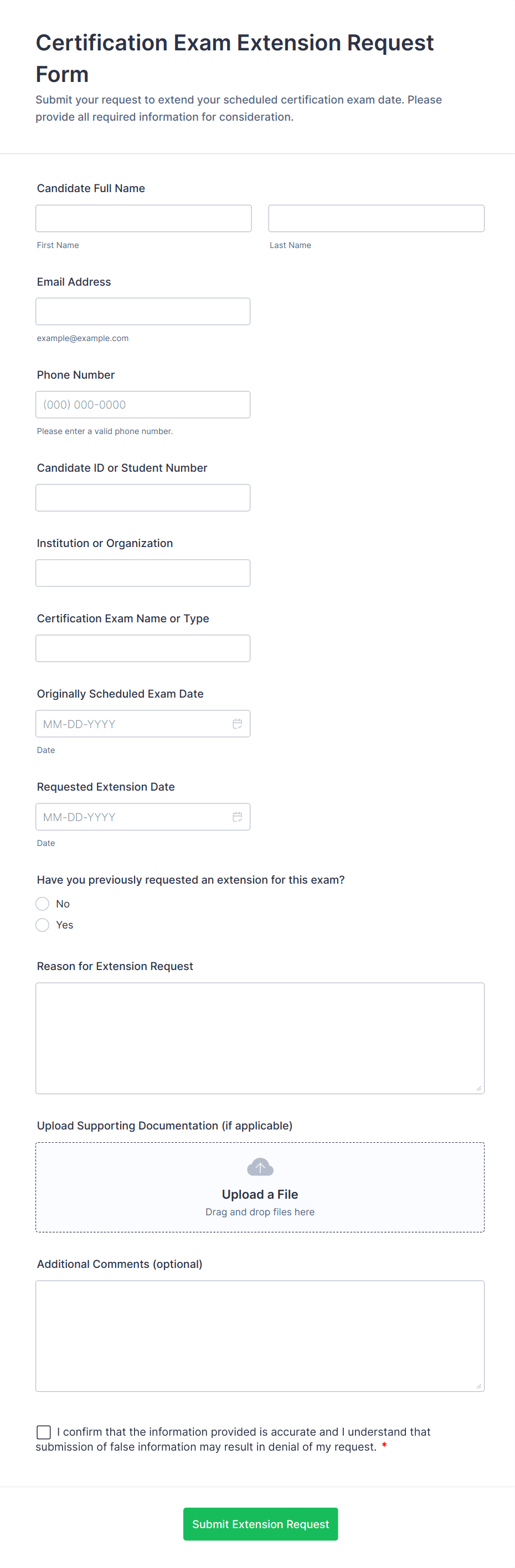 - Customize fields based on your use case. For example, academic forms may need course codes, while lease extensions require property details.