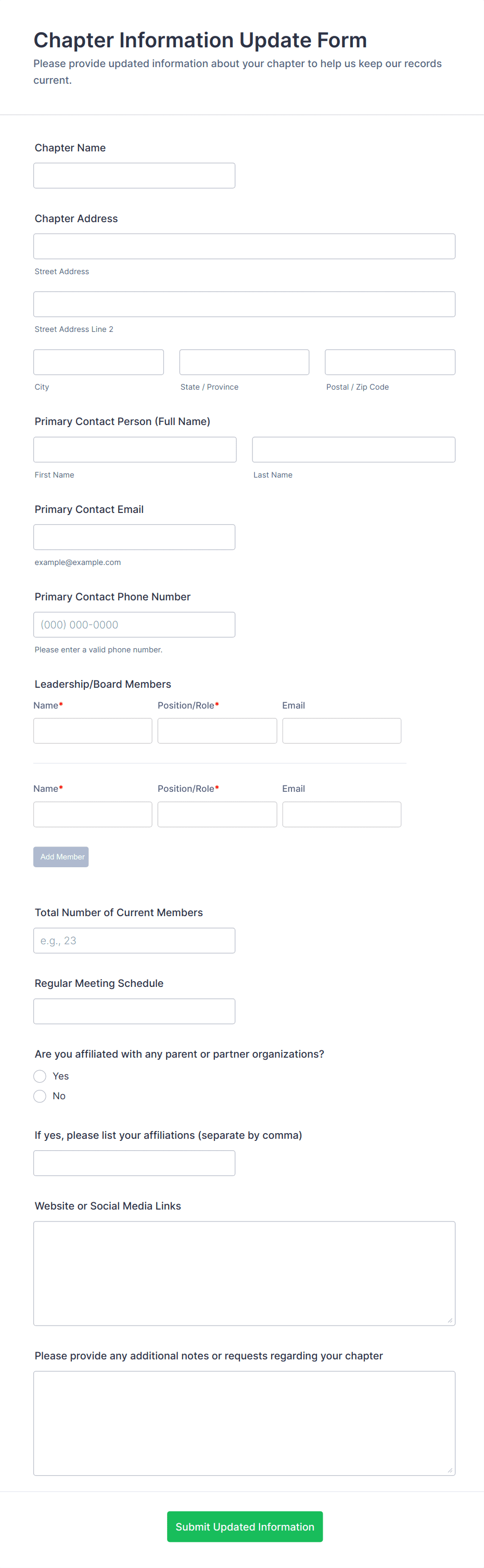 Information Form Templates are versatile digital forms designed to collect, organize, and manage a wide range of data from users, clients, or employees. These templates are commonly used for gathering personal details, contact information, feedback, preferences, or any other type of structured data required for business, educational, healthcare, or event-related purposes. Whether you need to onboard new clients, register participants for an event, collect feedback, or simply update records, information forms streamline the process by providing a standardized and efficient way to capture essential details.