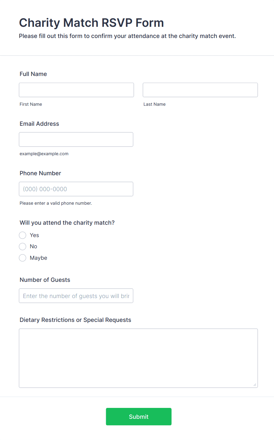 RSVP forms are digital tools designed to collect responses from invitees regarding their attendance at events, gatherings, meetings, or special occasions. Whether you’re organizing a wedding, corporate seminar, birthday party, or community event, RSVP forms streamline the process of confirming guest participation, gathering essential details like meal preferences, plus-ones, or special requirements. These forms help event organizers efficiently manage headcounts, plan logistics, and ensure a smooth experience for both hosts and attendees. The versatility of RSVP forms means they can be tailored for formal galas, casual get-togethers, virtual webinars, or even recurring club meetings.
