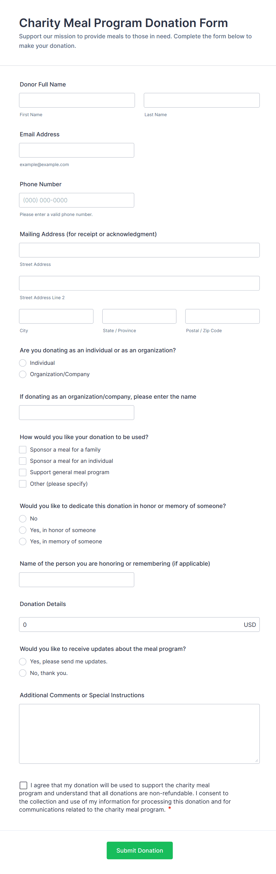 Donation forms are specialized online forms designed to collect contributions for charitable organizations, fundraising campaigns, nonprofit initiatives, and community projects. These forms streamline the process of gathering donor information, processing payments, and tracking contributions, making it easier for organizations to raise funds efficiently. Donation forms can be used for a variety of purposes, such as one-time or recurring donations, event sponsorships, crowdfunding efforts, membership drives, and emergency relief campaigns. They are essential tools for nonprofits, schools, religious groups, and community organizations seeking to engage supporters and facilitate secure, convenient giving.
