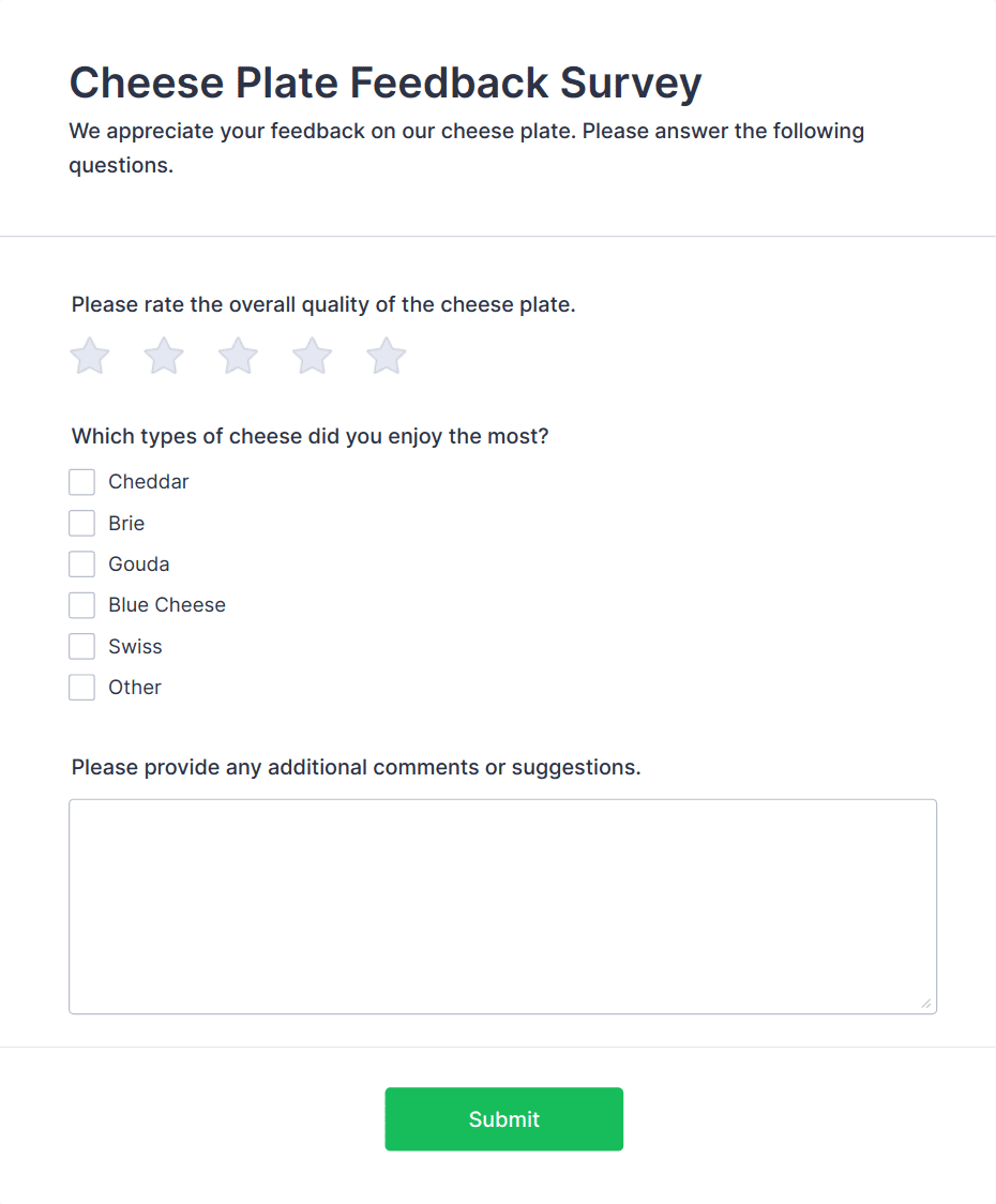 • Product feedback forms may include questions about usability, features, and likelihood to recommend.