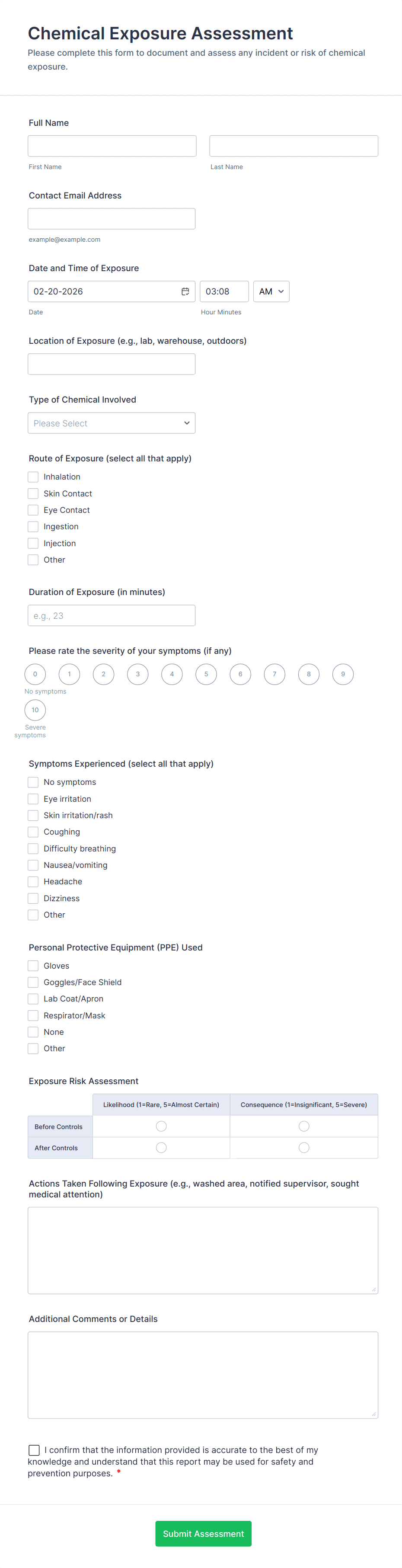 Chemical Exposure Assessment Form supports incident documentation and safety follow-up for labs, warehouses, and worksites by standardizing data collection and organizing each form submission in Jotform.