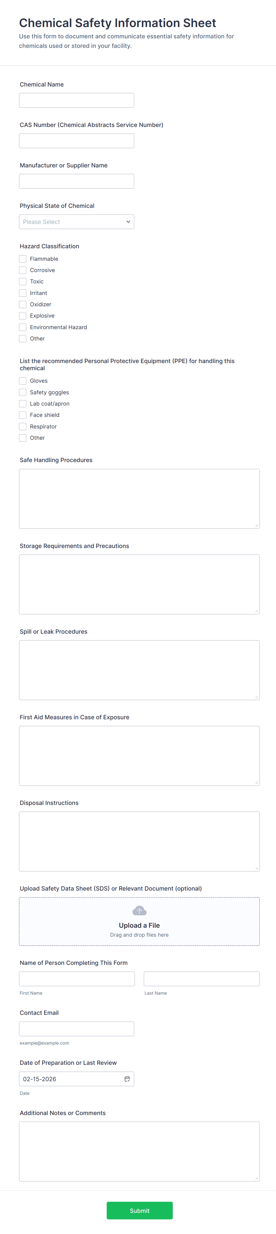 Include chemical or material name, hazard class, quantity, storage location, and required PPE. Add checkboxes for required safety steps.