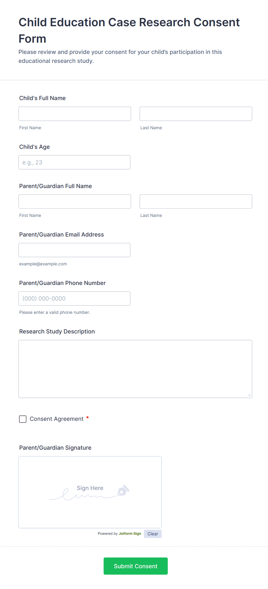 With Jotform, creating and managing informed consent forms becomes a seamless, efficient process. Jotform’s no-code Form Builder allows users to quickly design custom consent forms tailored to their specific needs, whether for healthcare, research, or business purposes. Users can leverage drag-and-drop functionality, integrate e-signature widgets, and set up conditional logic to ensure all necessary information is captured. Submissions are securely stored and easily accessible, streamlining compliance and record-keeping. Jotform’s extensive template library and integration options further simplify the process, making it easy for organizations to collect, manage, and protect consent data in a professional and compliant manner.