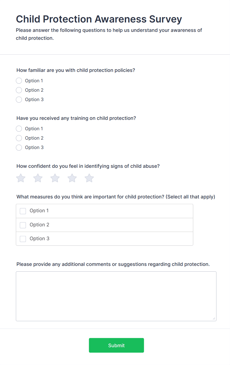 Survey templates are pre-designed forms that help individuals and organizations collect feedback, opinions, or data from a target audience. These templates are widely used for a variety of purposes, such as customer satisfaction surveys, employee engagement assessments, market research, event feedback, and academic studies. By providing a structured set of questions, survey templates streamline the process of gathering valuable insights, making it easier to analyze trends, measure satisfaction, and make informed decisions. Whether you’re a business owner, HR professional, educator, or researcher, survey templates offer a quick and effective way to reach your audience and collect actionable information.