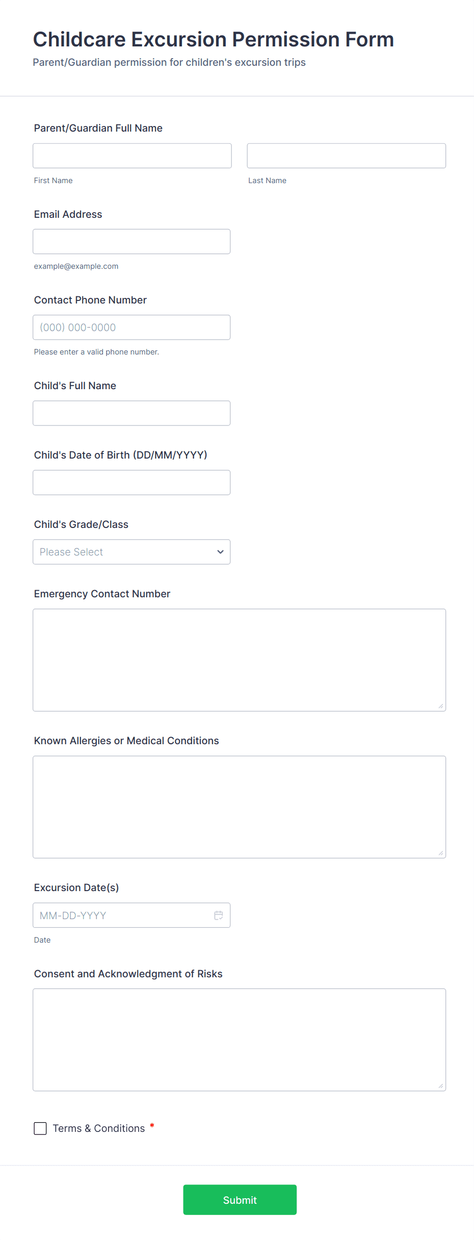 Collect parent or guardian consent for childcare participation, capture emergency details, and keep records organized with the Childcare Program Waiver Form in Jotform.