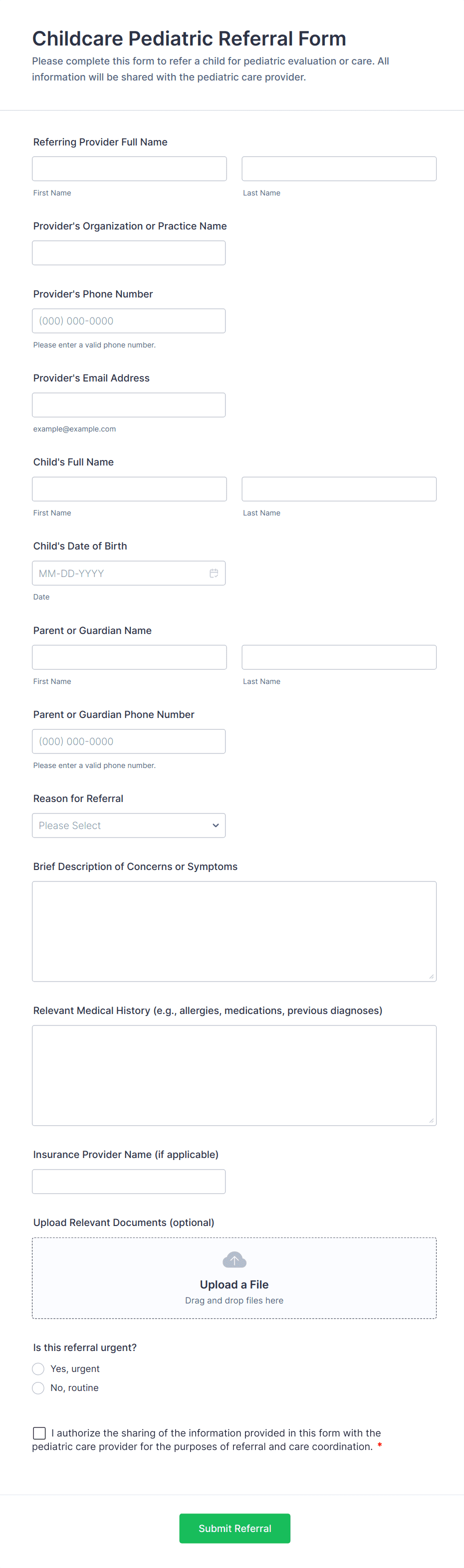 Referral forms are essential tools used to collect and manage information when one party recommends a person, service, or business to another. These forms streamline the process of gathering key details about the referred individual or entity, the referrer, and the context of the referral. Common use cases include employee referral programs, patient referrals in healthcare, client referrals in legal or financial services, and customer referrals in sales and marketing. By standardizing the referral process, organizations can ensure that all necessary information is captured efficiently, reducing miscommunication and speeding up follow-up actions.