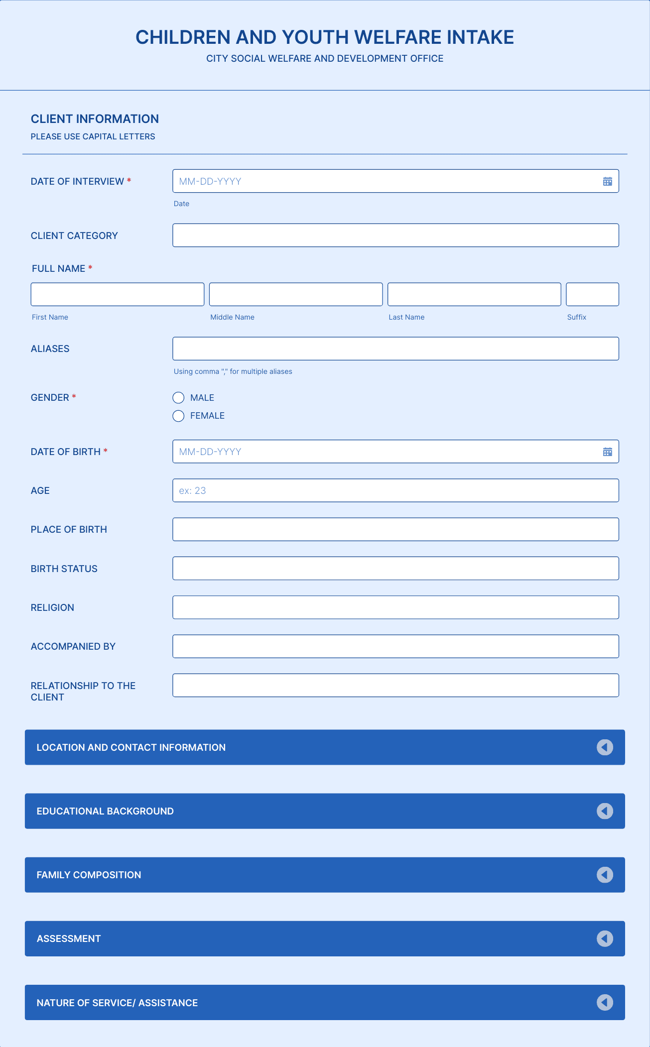 Common fields include requestor details, issue or request description, device or software information, urgency level, and supporting documentation.