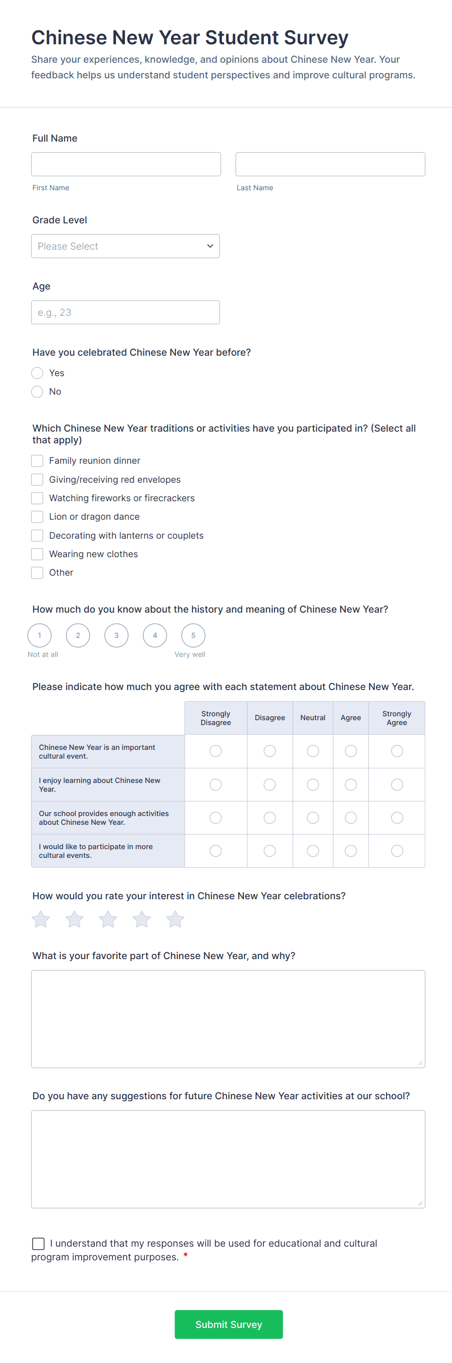 • For student or parent surveys, add questions about satisfaction, communication, and support services.