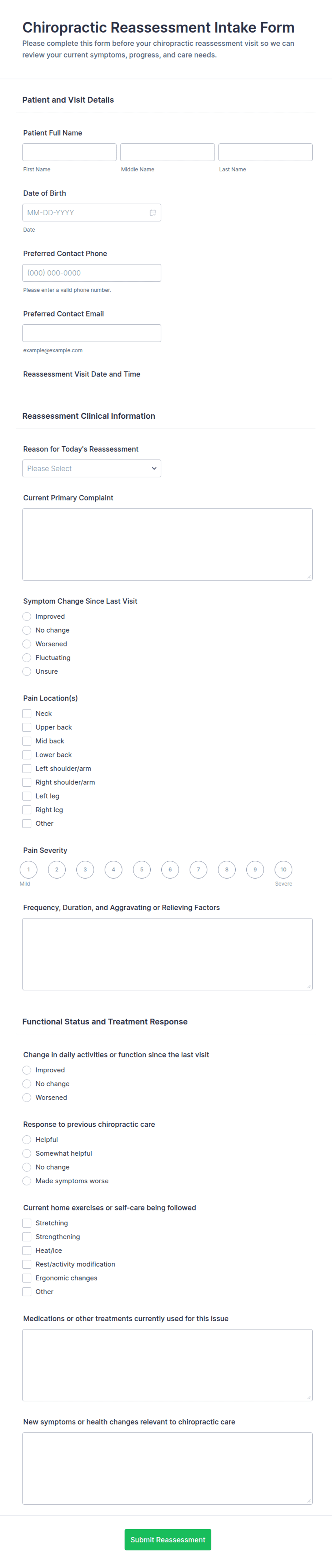 Capture updated reassessment details for chiropractic follow-up visits with the Chiropractic Reassessment Intake Form, built in Jotform for consistent data collection and organized form submission management across clinics and wellness practices.