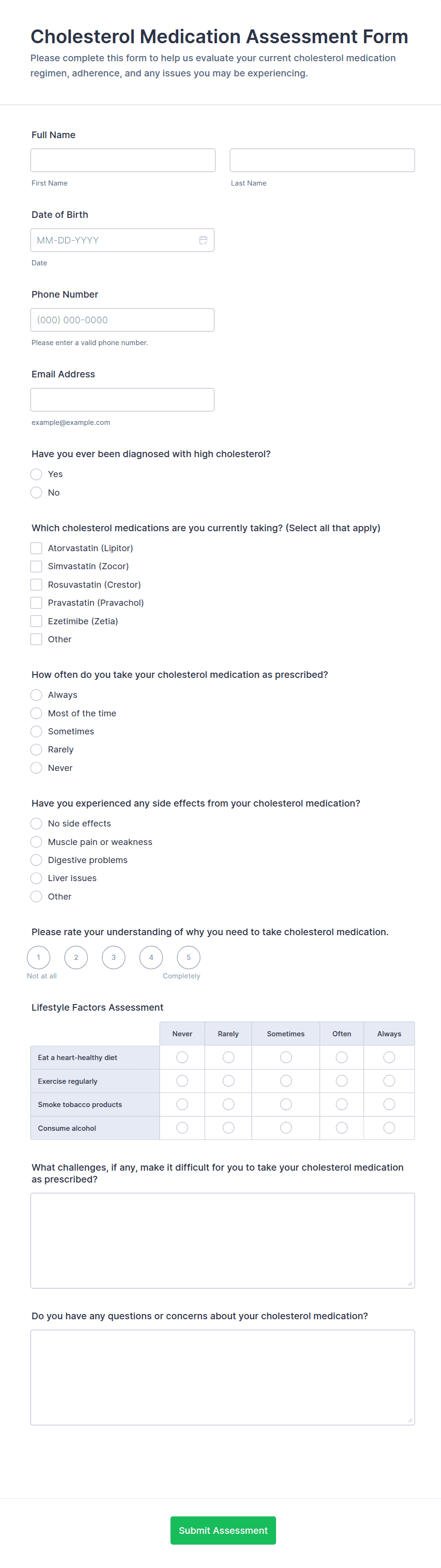 Add fields for symptoms, medical history, medications, allergies, lifestyle factors, and functional status depending on the assessment type. Use rating scales for severity and impact.