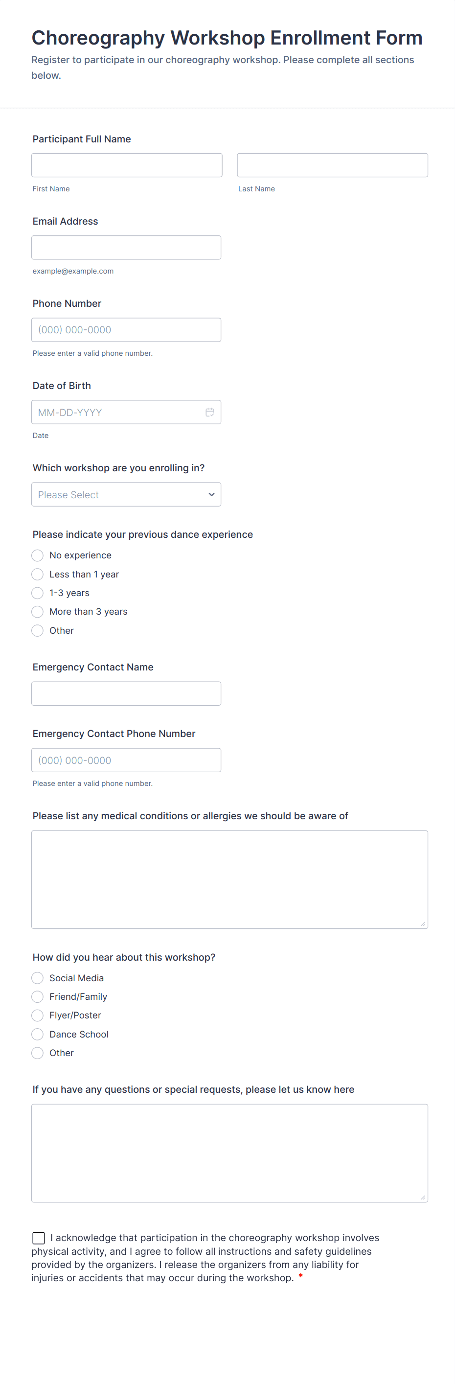 • For youth or minors: Include parental consent and emergency contact fields