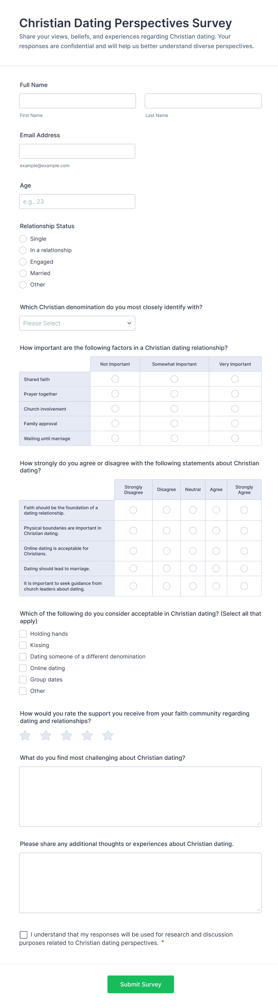 A Relationship Survey Template is a pre-designed online form used to collect feedback and insights about the quality, satisfaction, and dynamics of various types of relationships, such as romantic, professional, or familial.