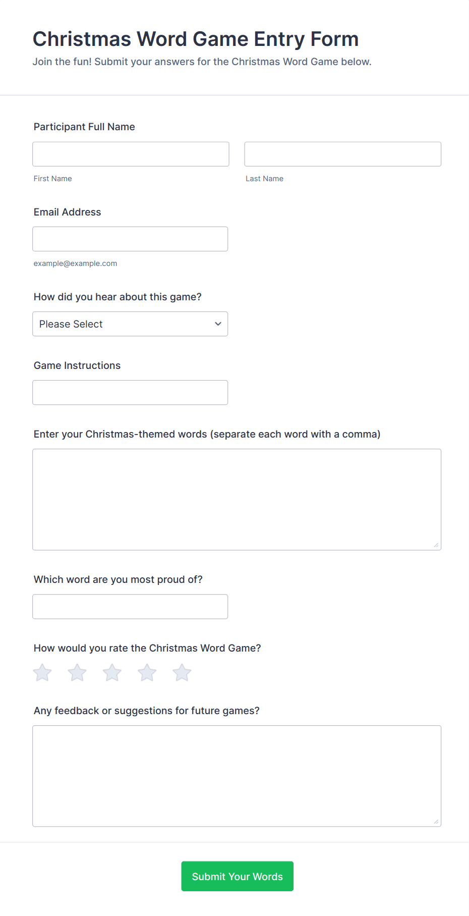 Christmas Forms are specialized online forms designed to streamline and enhance a wide range of holiday-related activities, from event planning and gift exchanges to volunteer sign-ups and festive surveys. These forms are perfect for individuals, organizations, schools, and businesses looking to organize Christmas parties, collect RSVPs, manage Secret Santa programs, gather wish lists, or coordinate charitable giving during the holiday season. By digitizing these processes, Christmas Forms help reduce paperwork, minimize confusion, and ensure that all details are collected efficiently and accurately.