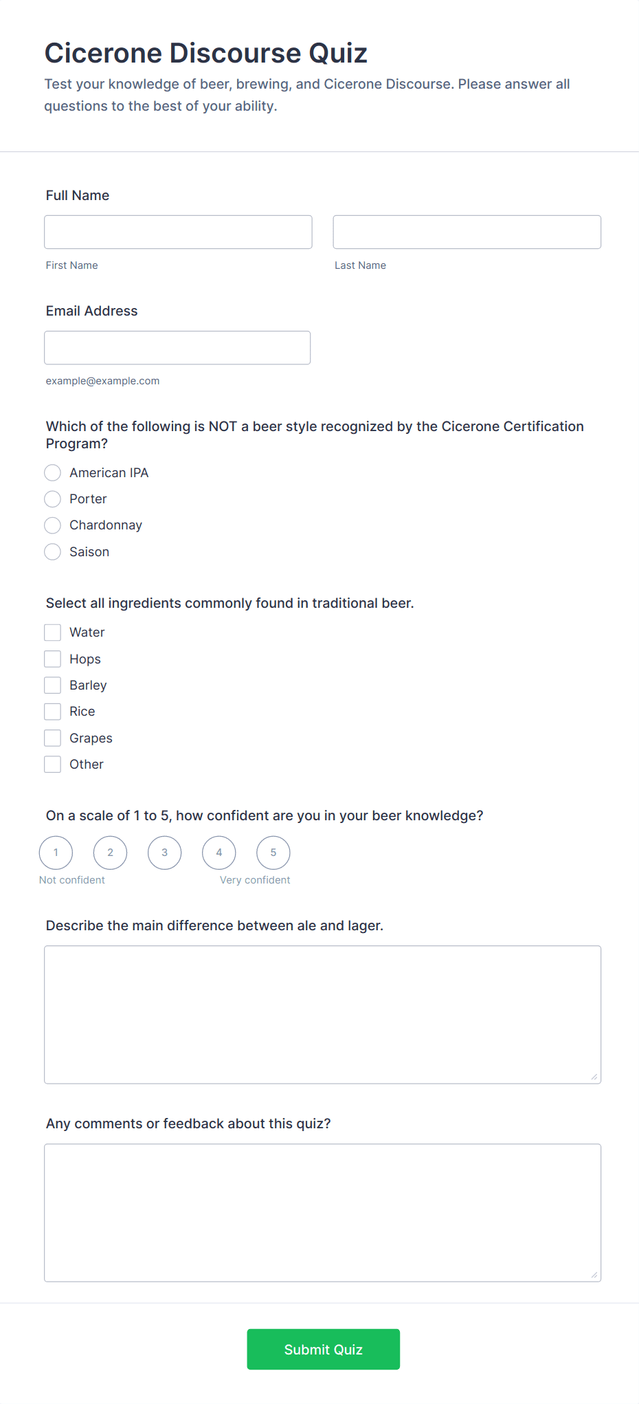 Quiz Templates are pre-designed forms specifically created to facilitate the process of building quizzes for a variety of purposes, such as education, employee training, lead generation, event engagement, and more. These templates provide a structured way to present questions, collect answers, and automatically score or evaluate responses. Whether you’re a teacher assessing student knowledge, a business running a product knowledge test, or a marketer creating a fun personality quiz, Quiz Templates offer a flexible foundation to suit your needs. They can be used for online exams, trivia games, onboarding assessments, customer feedback quizzes, and interactive learning modules.