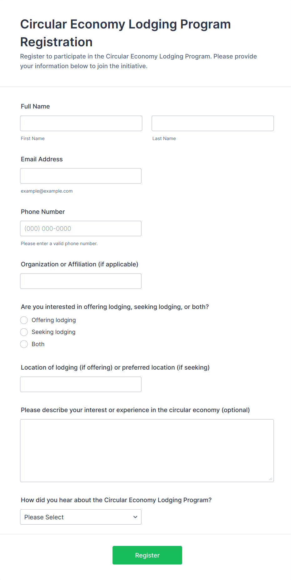 Collect business details for your consultancy or legal services agency with a free Business Entity Registration Form. Customize and embed in your website.