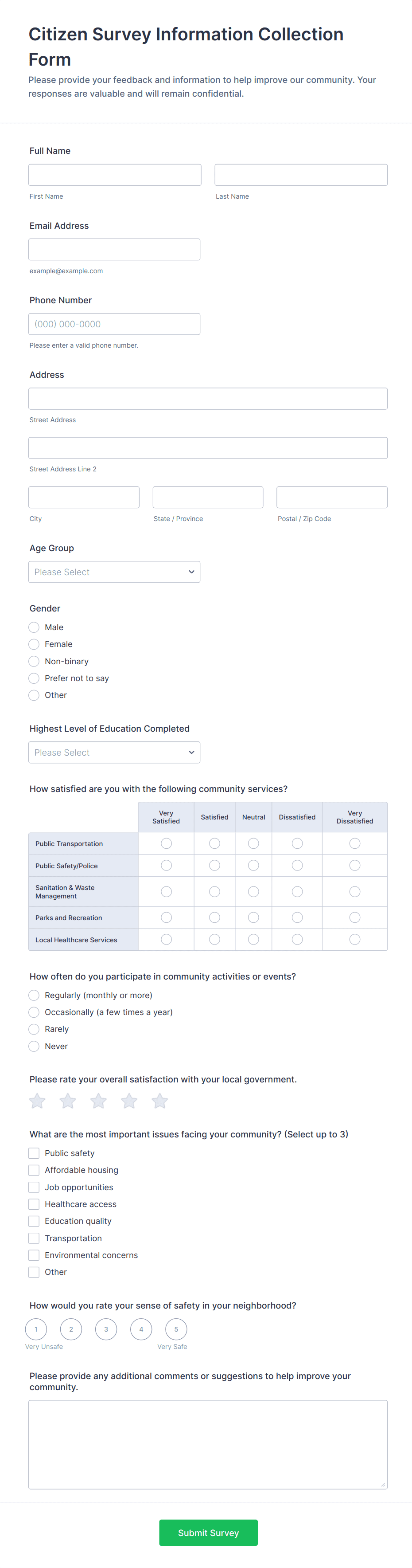 Accessibility Barriers in Public Spaces Survey Form helps cities, nonprofits, and community groups collect detailed feedback on accessibility issues in public areas for better planning and improvements.