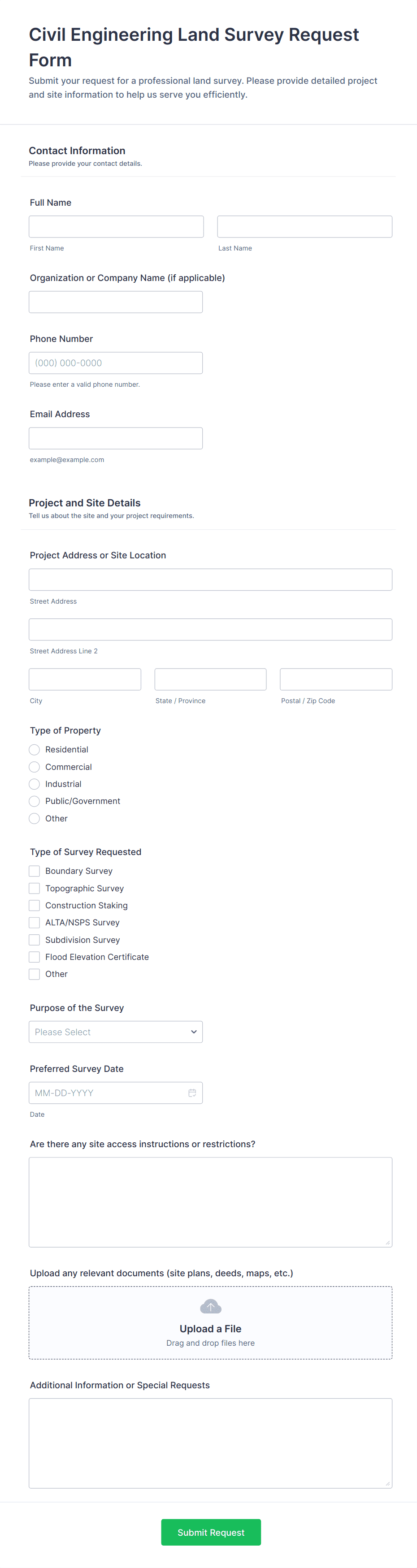Surveyor forms are used by land surveyors, civil engineers, construction managers, environmental consultants, real estate professionals, and utility companies for a range of data collection and reporting needs.